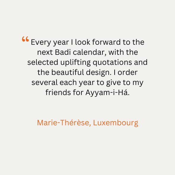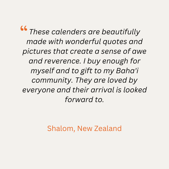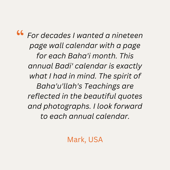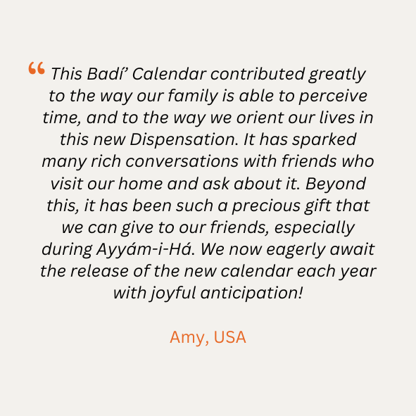 Badí’ Calendar Art is a family-run project by husband and wife, Noah Hamilton & Sarah Tesch, born out of a deep love and wonderment for the Badí’ Calendar, the calendar of the Bahá’í Faith. Our efforts are humbly offered with the hope of sharing this wonder with others, helping to uncover the spiritual gems within its divine mystery. Through our handcrafted calendars, reflection journals, and Bahá’í Holy Day cards, we aim to provide a meaningful service to humanity in this unique and glorious age—the Day of God.