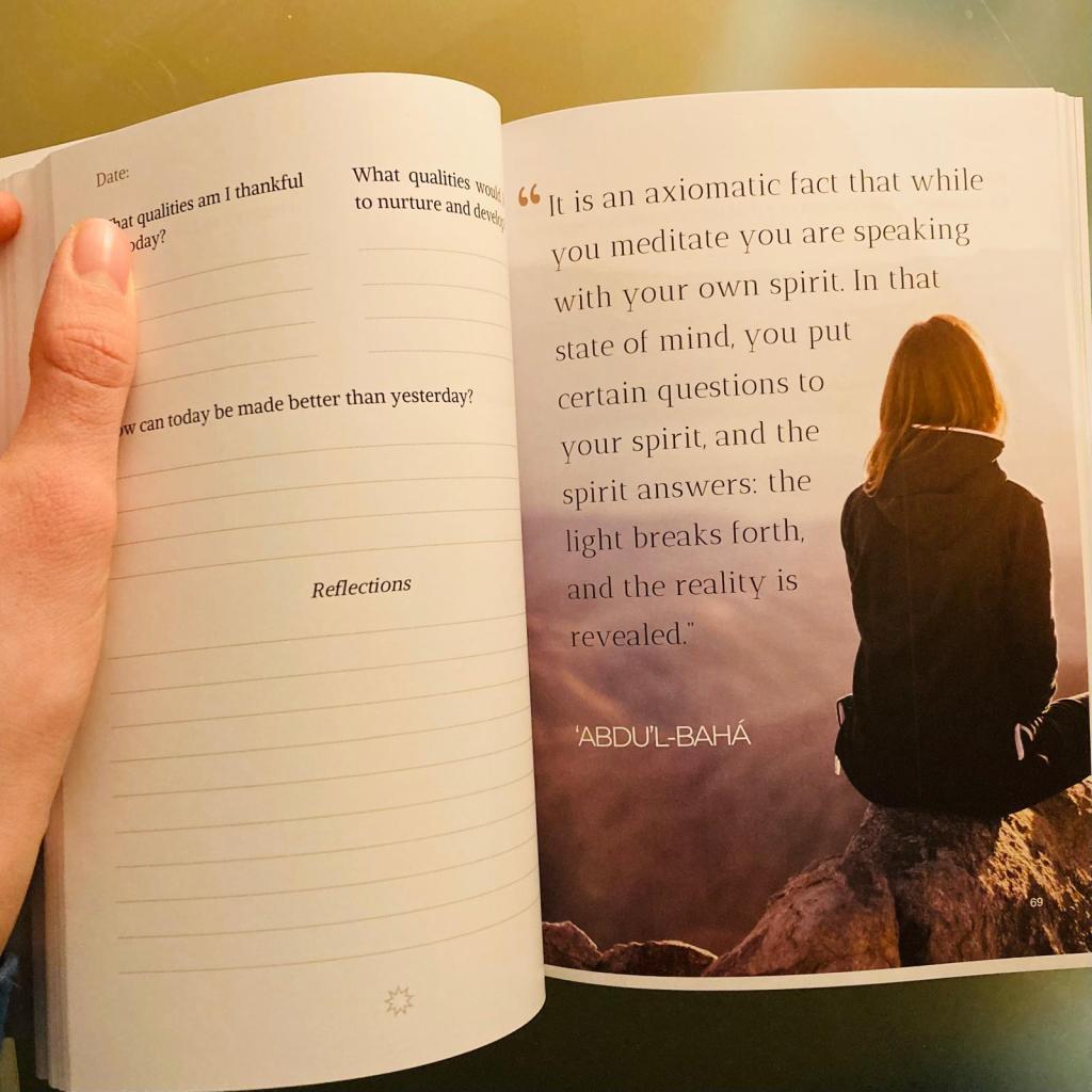 The Reflection and Meditation Journal is centered around the themes of reflection, meditation, and bringing oneself to account. It includes Bahá’í quotations throughout. The journal features both a structured section and open-ended spaces, making it a tool for personal growth and reflection, useful in various contexts.